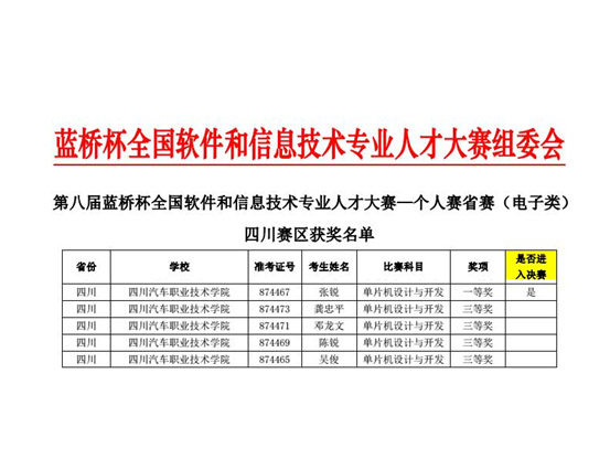 2017年4月8日,第八屆“藍(lán)橋杯”全國軟件和信息技術(shù)專業(yè)人才大賽個(gè)人賽省賽成功舉辦。當(dāng)天,來自全國31個(gè)省、市、自治區(qū)的1200余所高校的40000余名選手在全國185個(gè)賽點(diǎn)同臺競技,一展風(fēng)采。我院機(jī)電工程系應(yīng)用電子專業(yè)和汽車電子專業(yè)的5位同學(xué)由指導(dǎo)教師狄飛帶隊(duì),參加了在電子科技大學(xué)成都學(xué)院舉行的四川賽區(qū)電子類“單片機(jī)設(shè)計(jì)與開發(fā)”個(gè)人賽省賽的角逐。