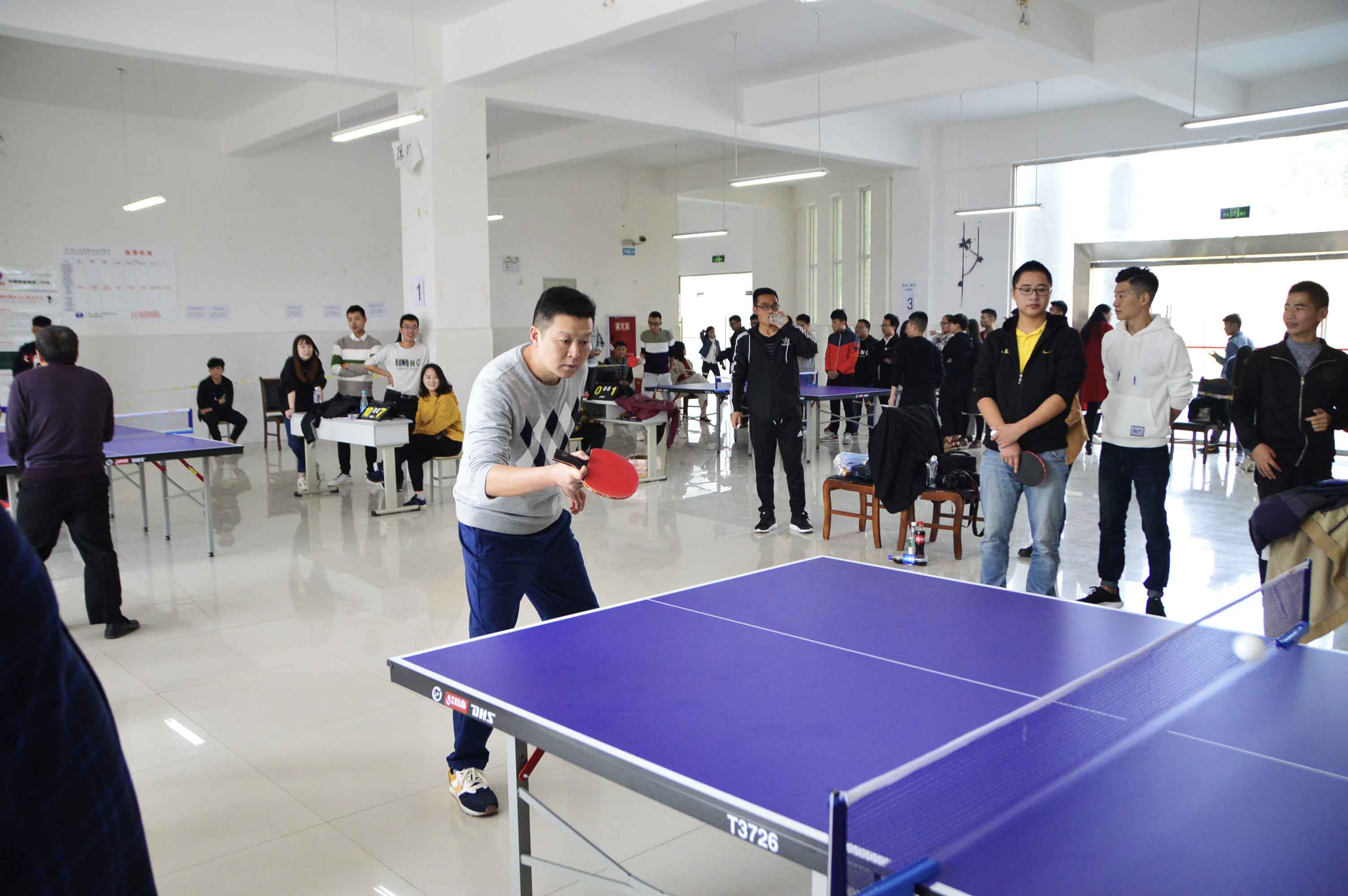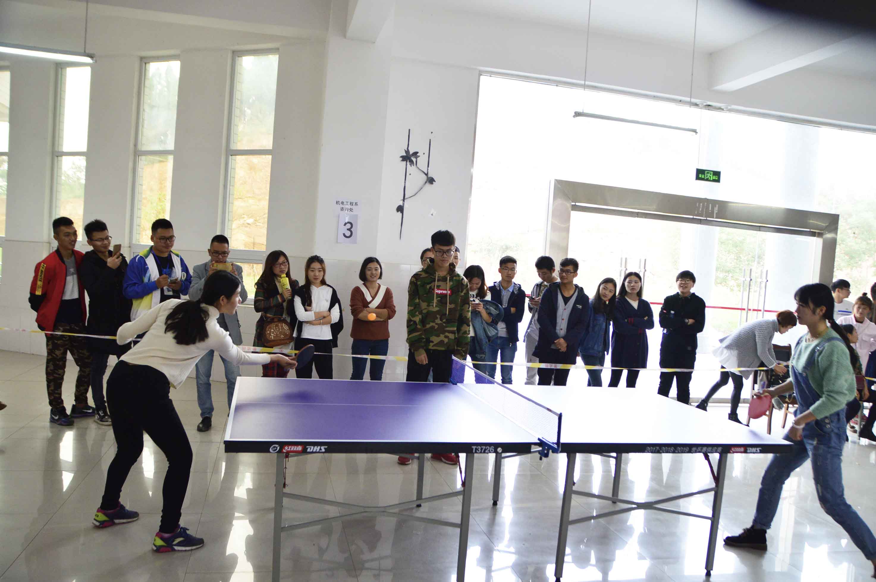 首先進(jìn)行的是教師隊(duì)伍的兵乓球比賽,各系(部)及機(jī)關(guān)的58名隊(duì)員組成6支勁旅分赴四個(gè)球桌進(jìn)行了男單、女單、男雙、女雙以及團(tuán)體賽。賽場(chǎng)上只見(jiàn)球拍揮舞,銀球飄飛,選手們推拉旋擊,各顯神通,觀眾唏噓掌聲不斷,喝彩叫好連連。