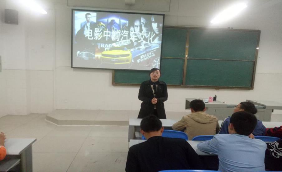 龔主任以“你可能會(huì)因?yàn)橐徊侩娪岸J(rèn)識(shí)一款車,也可能會(huì)因?yàn)橐豢钴嚩鴮?duì)一部電影印象深刻”為導(dǎo)言拉開了此次講座的序幕。她旁征博引,講到:“不同國(guó)家的電影背后代表著不同國(guó)家的文化,比如英國(guó)的優(yōu)雅、美國(guó)的先進(jìn)、意大利的浪漫。而為了更好地演繹不同文化的特色,汽車與電影,天生就有解不開的緣分,往往能起到‘畫龍點(diǎn)睛’的效果!苯又,龔主任主要從電影與汽車的關(guān)系和汽車文化兩個(gè)大方面,通過(guò)大量影片的播放和一系列數(shù)據(jù)分析,使學(xué)生們了解了汽車在電影中的作用和地位,并使學(xué)生認(rèn)識(shí)到了電影對(duì)汽車銷量的影響。