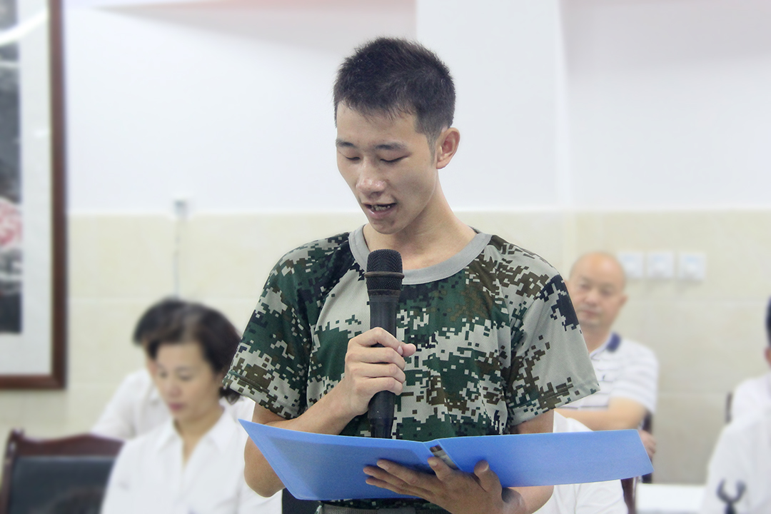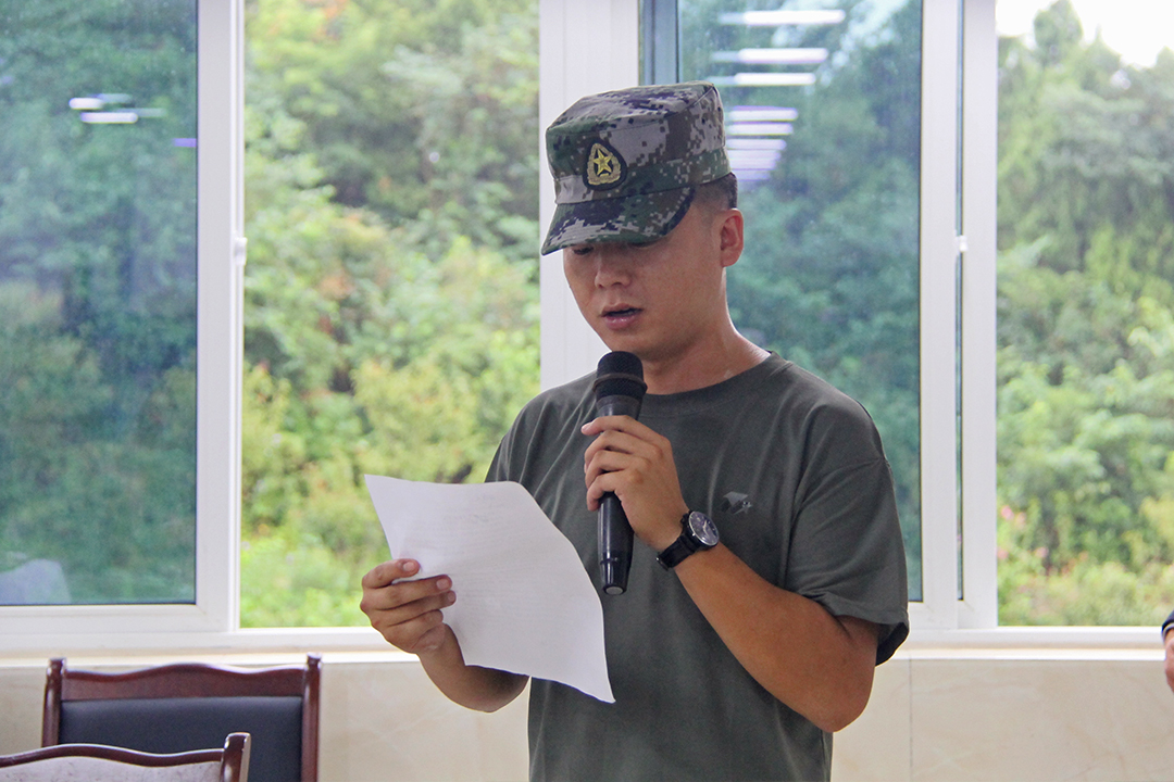 教官代表湯茗捷連長發(fā)表講話。他表示將會認真履行教官職責,決落實各項規(guī)章制度;以身作則,發(fā)揚不怕苦、不怕累的精神,讓同學(xué)們提高政治思想意識,增強組織紀律意識,強健體魄,磨練意志,養(yǎng)成雷厲風行的軍人作風和高尚的道德情操;并盡力營造良好的軍訓(xùn)和生活氛圍,想同學(xué)之所想、幫同學(xué)之所需、解同學(xué)之所惑,圓滿完成此次軍訓(xùn)任務(wù)。