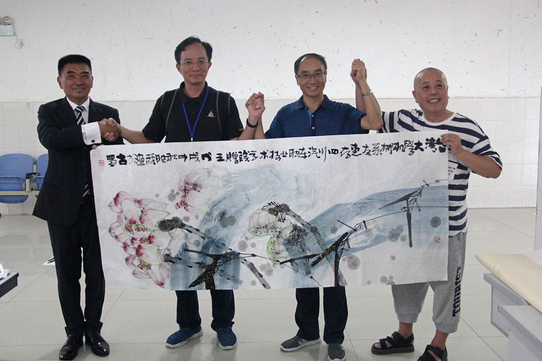 隨后,參訪團(tuán)來到圖書館,藝術(shù)系正在舉行一場(chǎng)中國(guó)畫繪畫表演,傳播中國(guó)書畫藝術(shù)。兩岸文化同根同源一家親,通過藝術(shù)系師生對(duì)傳統(tǒng)中國(guó)畫“畫面有意境、畫外有精神、畫外有畫”的精湛演繹,雙方很快又找到了血脈相連的契合點(diǎn),共同感受中國(guó)傳統(tǒng)文化的魅力。藝術(shù)系吳映強(qiáng)老師的作品《清氣滿乾坤》恢宏大氣、意境深遠(yuǎn),深受嘉賓的喜愛。鄧斌院長(zhǎng)代表學(xué)校把這幅作品贈(zèng)送給參訪團(tuán),作為雙方友誼的見證。