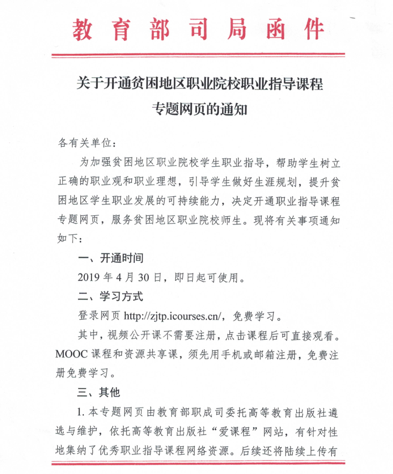 關(guān)于轉(zhuǎn)發(fā)教育部職成司《關(guān)于開通貧困地區(qū)職業(yè)院校職業(yè)指導課程專題網(wǎng)頁的通知》的通知