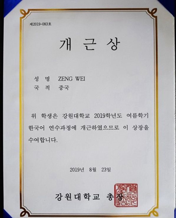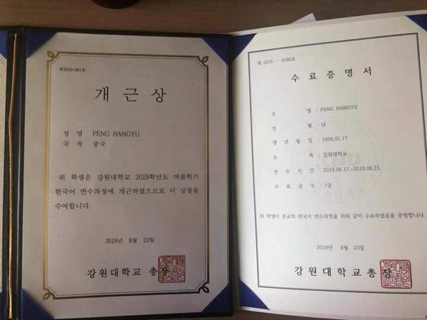 8月23日,我校2019年在韓國國立江原大學(xué)留學(xué)的5名學(xué)生因成績和表現(xiàn)優(yōu)異,得到了韓國國立江原大學(xué)校方的表彰。
