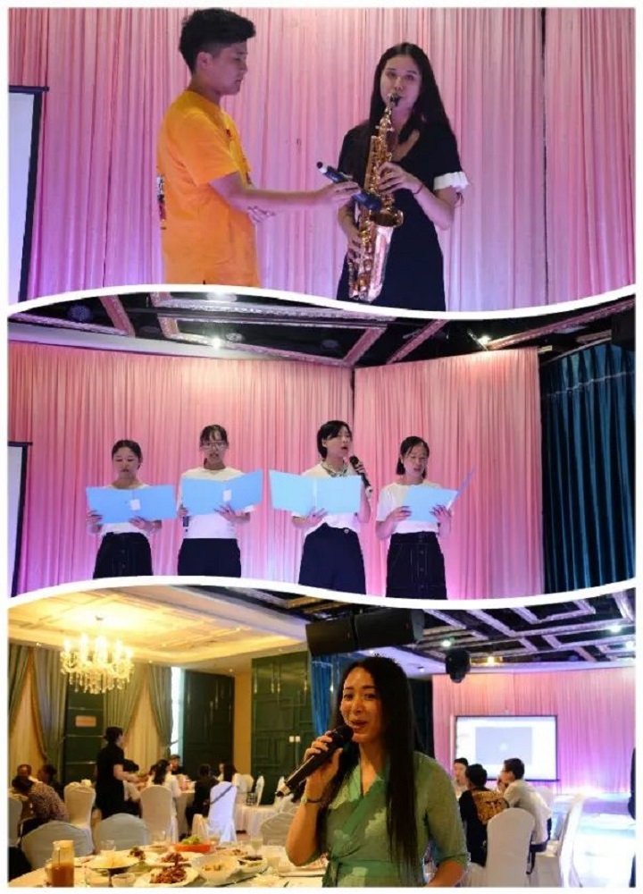 學校領(lǐng)導(dǎo)向先進教師、先進班主任、先進管理工作者、先進招生教師、先進教練員頒發(fā)榮譽證書及獎金。中午,全體教職員工歡聚萬達,進行豐富多彩的文藝演出。
