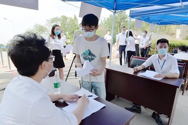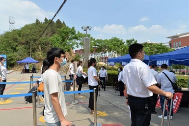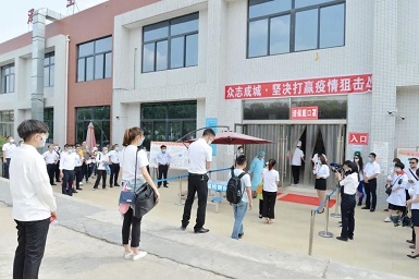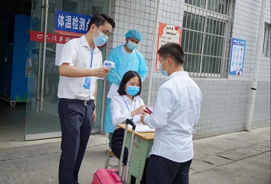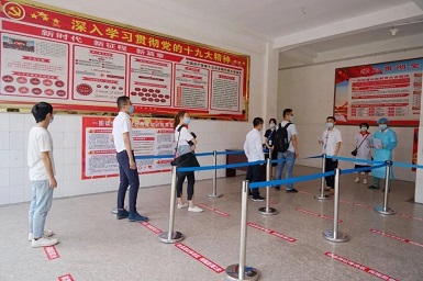 校門(mén)外設(shè)置了學(xué)生等候區(qū)、體溫測(cè)試點(diǎn)、報(bào)到注冊(cè)點(diǎn)和應(yīng)急觀(guān)察點(diǎn)。學(xué)生返校必須間隔1米,依次進(jìn)入體溫測(cè)試點(diǎn)進(jìn)行測(cè)試,進(jìn)行手消毒,體溫正常則進(jìn)入學(xué)校,體溫異常則送應(yīng)急觀(guān)察點(diǎn)。班主任負(fù)責(zé)收取學(xué)生健康卡、承諾書(shū)等資料。