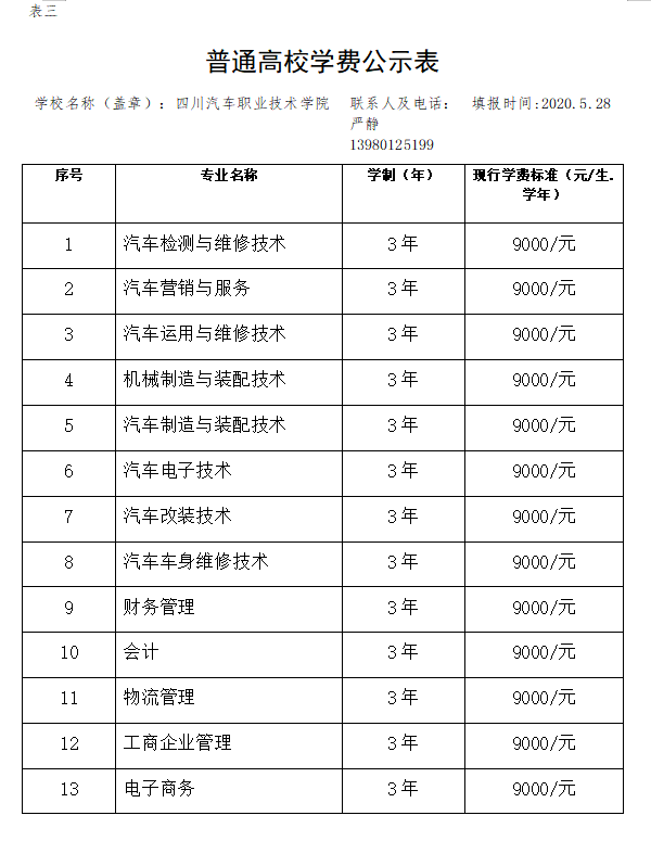 普通高校學(xué)費(fèi)及住宿費(fèi)公示