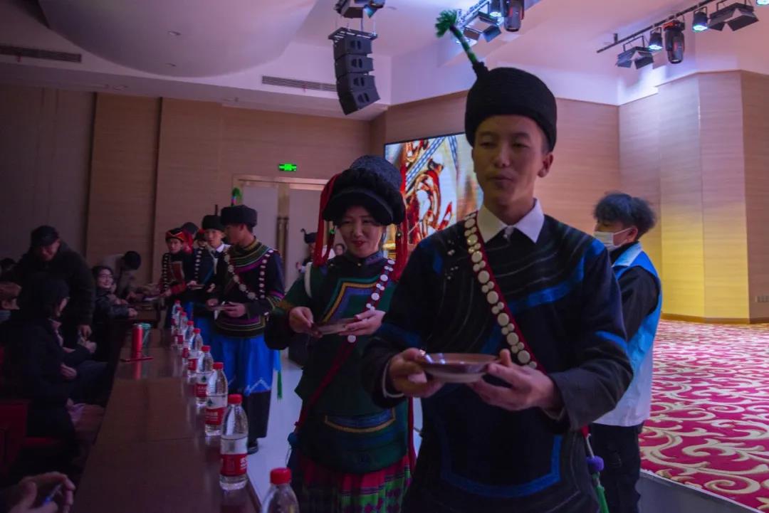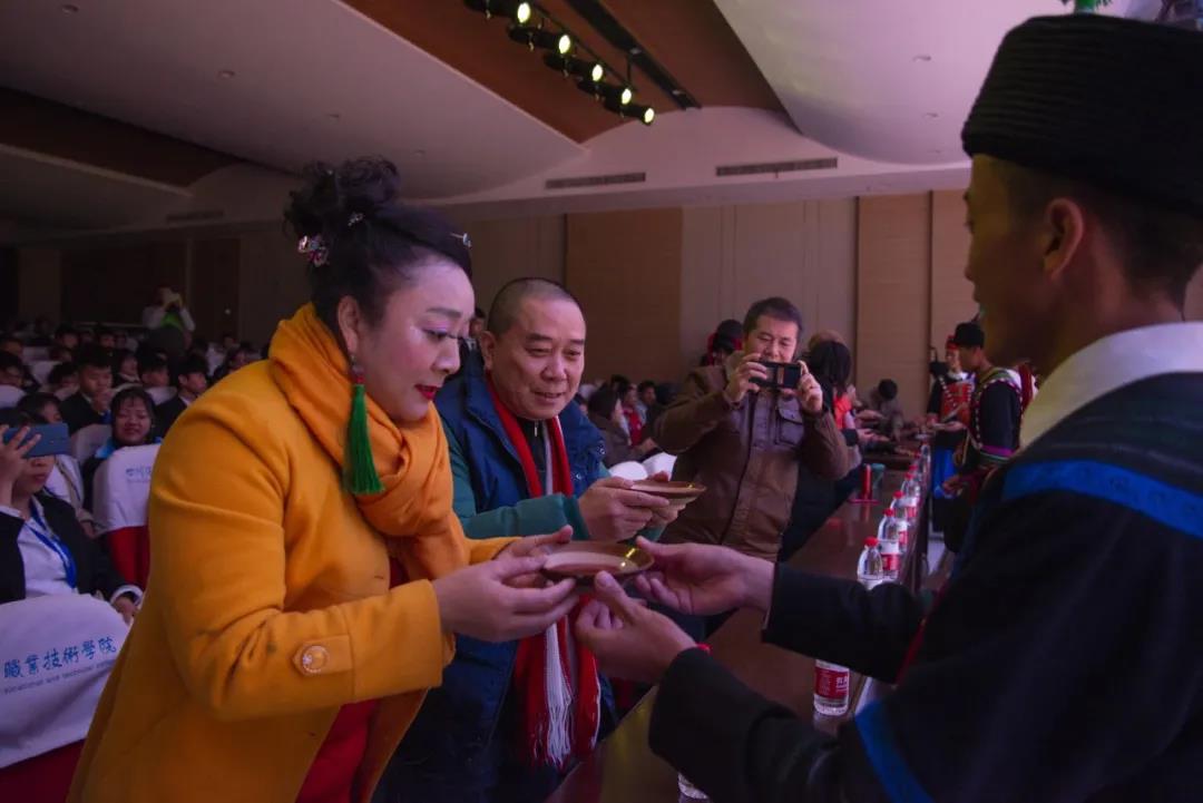 彝族同學向參加晚會的嘉賓敬酒,并獻上英雄帶。