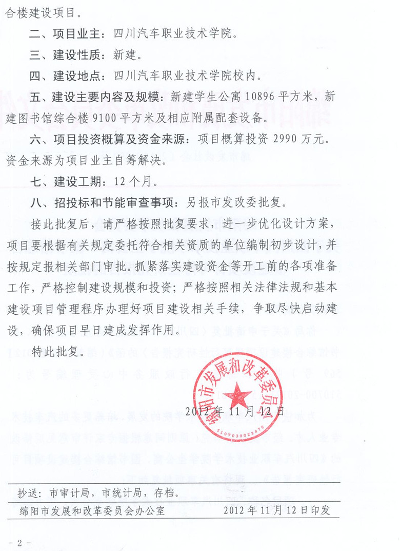 綿陽市發(fā)展和改革委員會關(guān)于四川汽車職業(yè)技術(shù)學(xué)院學(xué)生公寓、圖書館綜合樓建設(shè)項(xiàng)目可行性研究報告的批復(fù)