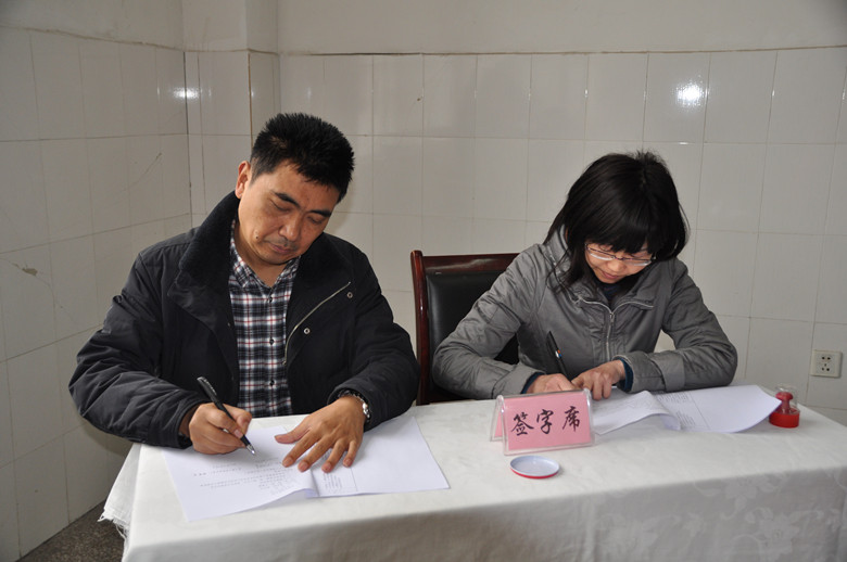 (機電系副主任兼黨總支副書記敬素清正在和鄧院長簽訂目標(biāo)責(zé)任書。)