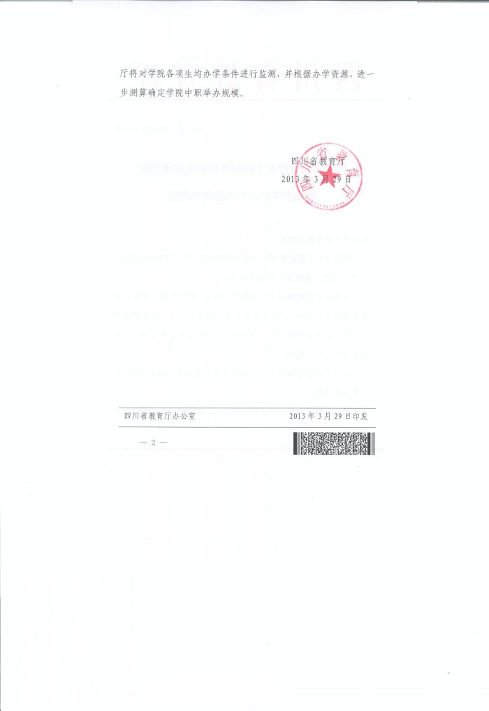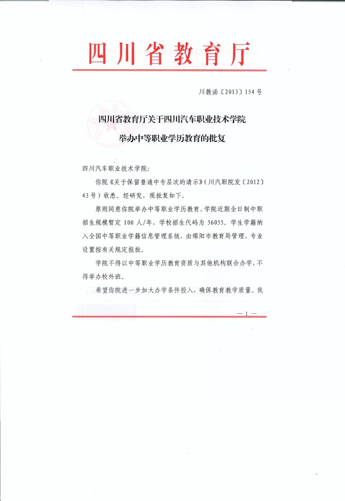 四川省教育廳關(guān)于四川汽車職業(yè)技術(shù)學(xué)院舉辦中等職業(yè)學(xué)歷教育的批復(fù)
