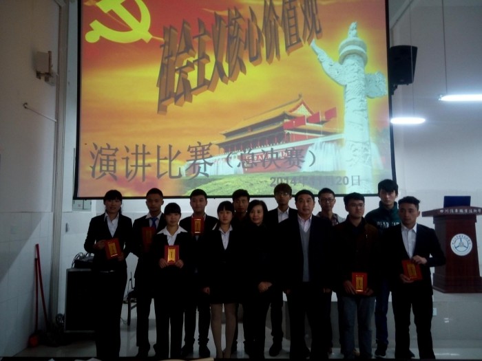 為了貫徹落實(shí)川教函【2014】540號(hào)《關(guān)于在全省各級(jí)各類學(xué)校開展培育和踐行社會(huì)主義核心價(jià)值觀“唱讀寫畫演講展”教育活動(dòng)的通知》文件精神,11月20日,我院團(tuán)委學(xué)工部特在學(xué)院學(xué)術(shù)大廳組織舉辦了以“社會(huì)主義核心價(jià)值觀”為主題的演講比賽。經(jīng)過對(duì)預(yù)賽選手嚴(yán)格篩選,共有14名同學(xué)進(jìn)入總決賽。演講總決賽現(xiàn)場(chǎng)特別邀請(qǐng)了董事長、院長鄧斌,常務(wù)副院長、黨委書記袁應(yīng)柏等院領(lǐng)導(dǎo)出席,各系部負(fù)責(zé)人和部分教師做評(píng)委,汽車機(jī)電工程系和經(jīng)濟(jì)管理系部分學(xué)生觀看演講比賽。