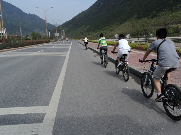 (同學(xué)們奮力騎車在北川的道路上)
