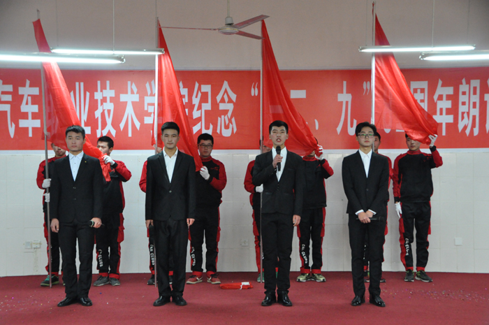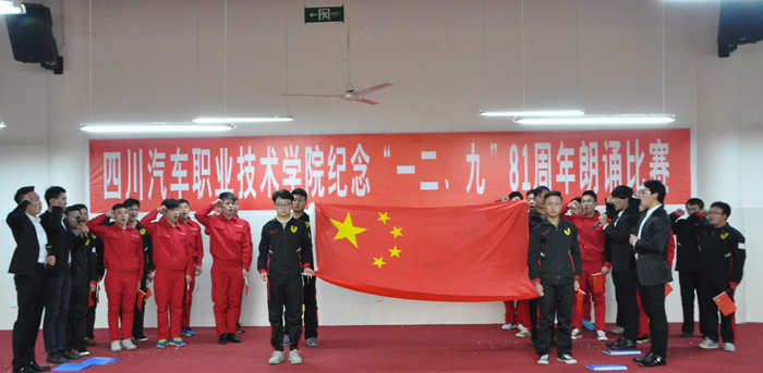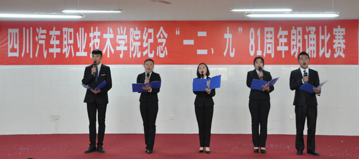 12月6日下午,四川汽車職業(yè)技術(shù)學(xué)院在學(xué)術(shù)報告廳舉行了紀(jì)念“一二·九”81周年朗誦比賽,本次比賽以“愛國、愛校、愛家”為主題。本次比賽,通過紀(jì)念“一二·九”運動,勉勵大學(xué)生們傳承愛國憂患意識,弘揚民族自強精神,培育當(dāng)代青年以天下為己任的擔(dān)當(dāng)勇氣,通過以朗誦詩歌的形式抒發(fā)愛國情懷,紀(jì)念“一二·九”愛國運動。學(xué)院黨委書記袁應(yīng)柏、團委書記鄧力軒、學(xué)工部長魏偉華出席,近五百名學(xué)生觀看了本次比賽。
