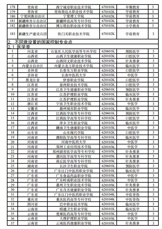 三、截至2018年11月1日,我部共受理2019年擬新設(shè)的國家控制高職專業(yè)點申請469個。經(jīng)過專家評議和公安部、司法部、衛(wèi)生健康委、中醫(yī)藥局等行業(yè)主管部門審核,同意2019年新設(shè)的國家控制高職專業(yè)點225個,自2019年起可以招生,其專業(yè)名稱、專業(yè)代碼、修業(yè)年限等均以本通知公布的內(nèi)容為準。不同意2019年新設(shè)的國家控制高職專業(yè)點244個。