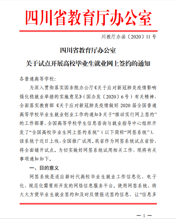 四川省教育廳辦公室——關(guān)于試點(diǎn)開展高校畢業(yè)生就業(yè)網(wǎng)上簽約的通知