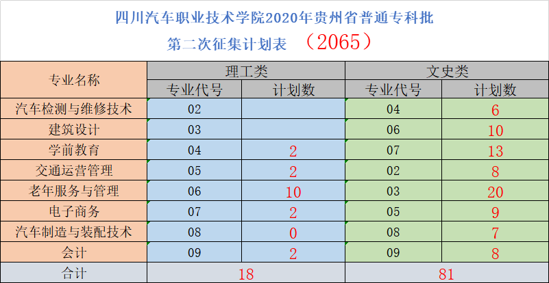 四川汽車職業(yè)技術(shù)學(xué)院(招生代碼:2065)現(xiàn)有部分志愿征集計劃,面向成績達(dá)到貴州省?瓶刂品?jǐn)?shù)線(文史180分,理工180分)而未被錄取的考生,現(xiàn)將征集志愿公告如下: