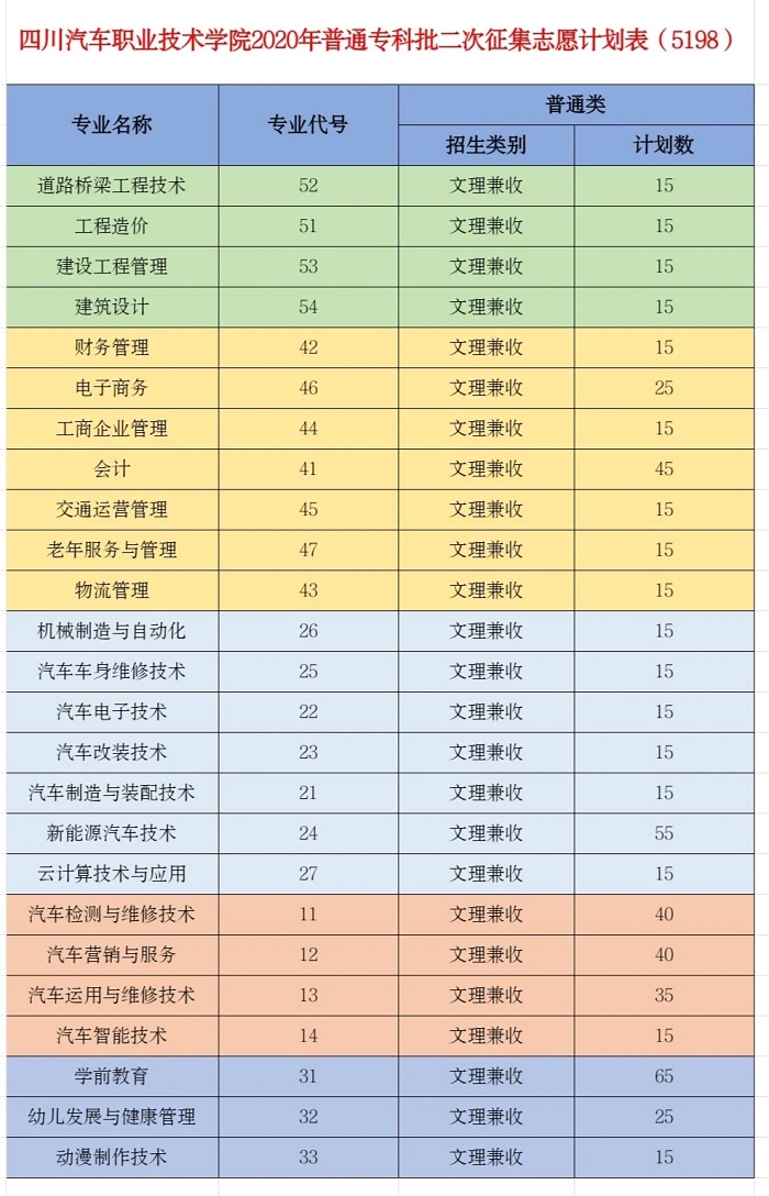 四川汽車職業(yè)技術(shù)學院(招生代碼:5198)現(xiàn)有部分志愿征集計劃,面向成績達到四川省?瓶刂品謹(shù)線而未被錄取的考生,現(xiàn)將征集志愿公告如下: