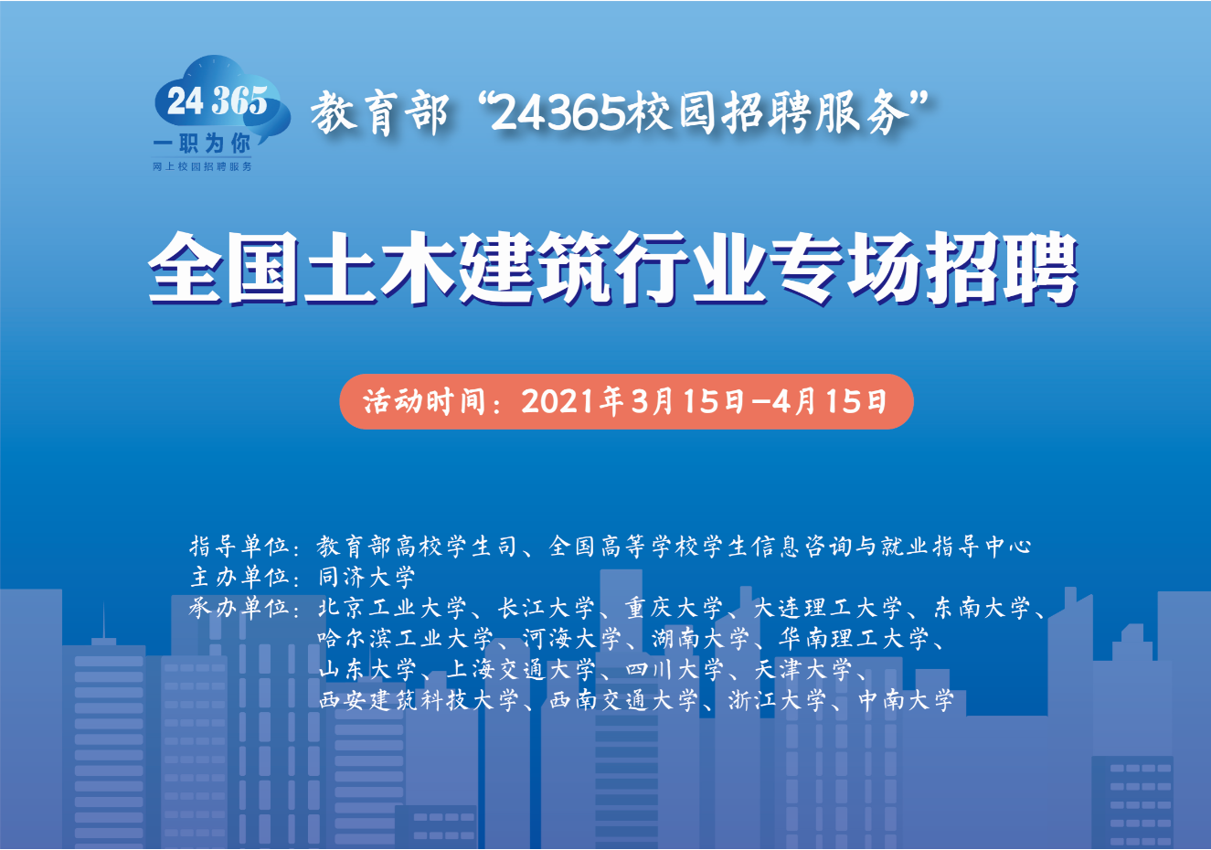 為貫徹落實(shí)黨中央、教育部關(guān)于高校畢業(yè)生就業(yè)工作的決策部署,更好的為畢業(yè)生和用人單位搭建安全、便捷、高效的信息溝通和雙向選擇平臺(tái),積極推動(dòng)土木建筑行業(yè)與高校畢業(yè)生人才的精準(zhǔn)對(duì)接,包括我校在內(nèi)的20所高校將共同聯(lián)合舉辦教育部“24365校園招聘活動(dòng)”——“奮楫揚(yáng)帆潮頭立,筑夢(mèng)青春正當(dāng)時(shí)”全國(guó)土木建筑行業(yè)專場(chǎng)招聘會(huì)。