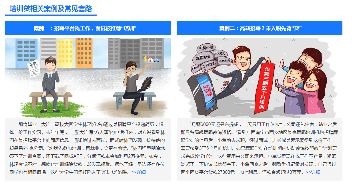 據(jù)相關(guān)報(bào)道,一些不法培訓(xùn)機(jī)構(gòu)利用學(xué)生在不同求職季急于找到工作的不安心理,設(shè)下騙局,使許多學(xué)生在不清楚合同內(nèi)容的情況下卷入“培訓(xùn)貸”的層層陷阱,致使有些大學(xué)生還沒入職便背上高額貸款。那么,“培訓(xùn)貸”的常用套路有哪些?大學(xué)生怎樣防止被騙?一起來看!