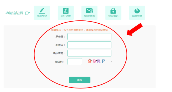 成功登錄專業(yè)志愿填報(bào)系統(tǒng)后,修改系統(tǒng)密碼,考生一定要記清楚自己修改的密碼便于下一次登錄使用。修改成功會(huì)提示考生再一次登錄系統(tǒng)。