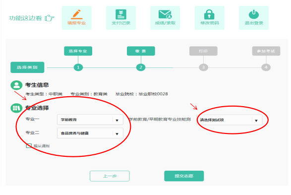 選擇自己報(bào)考的專業(yè),可以選擇兩個(gè)專業(yè),并勾選服從調(diào)劑,確認(rèn)無(wú)誤后,點(diǎn)擊“提交志愿”按鈕。