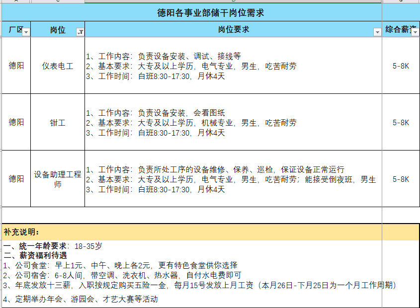 【崗位】:設(shè)備維修、設(shè)備管理儲干100名